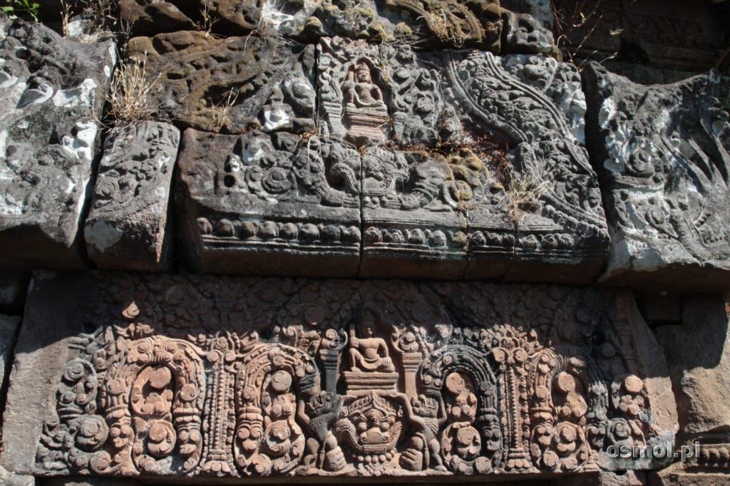 Bo turystów tu niewielu, za to Laotańczyków sporo. Oni przyszli tu modlić się i złożyć ofiarę, zapalić kadzidełko. I z tego powodu warto postać z boku wnętrza. By obserwować to wszystko, co się dzieje. Poczuć atmosferę miejsca. I poczuć kadzidełka. Będąc tu, warto usiąść gdzieś z boku i po prostu odpocząć w cieniu oraz przyjrzeć się Wat Phou. Zdobienia są charakterystyczne dla sztuki Khmerów. Ale to co mnie zachwyciło, to idealne wkomponowanie świątyni w okolicę. Miałem wrażenie, jakby była ona pokryta siatką maskującą. A wszystko przez zieleń pokrywającą kamienie oraz przez promienie słońca przedzierające się przez gęste korony drzew.