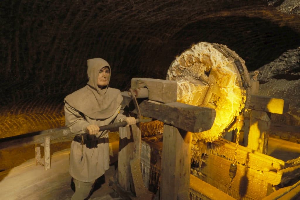 Dziś jednak, w przeciwieństwie do starych czasów, na turystów czeka mnóstwo atrakcji, które opowiadają o pracy w kopalni. Zobaczymy tu np. kieraty, którymi podnoszono w górę szybikami, solne bałwany (czyli ociosane bryły soli) oraz opuszczano drewniane bale. Będą tu też naturalnej wielkości konie oraz górnicy w tradycyjnych roboczych strojach. Cóż, jeśli wyobrażacie sobie tych dawnych górników jako postacie odziane w worki z kapturami, to mniej więcej tak to wygląda. Sami zresztą zerknijcie.