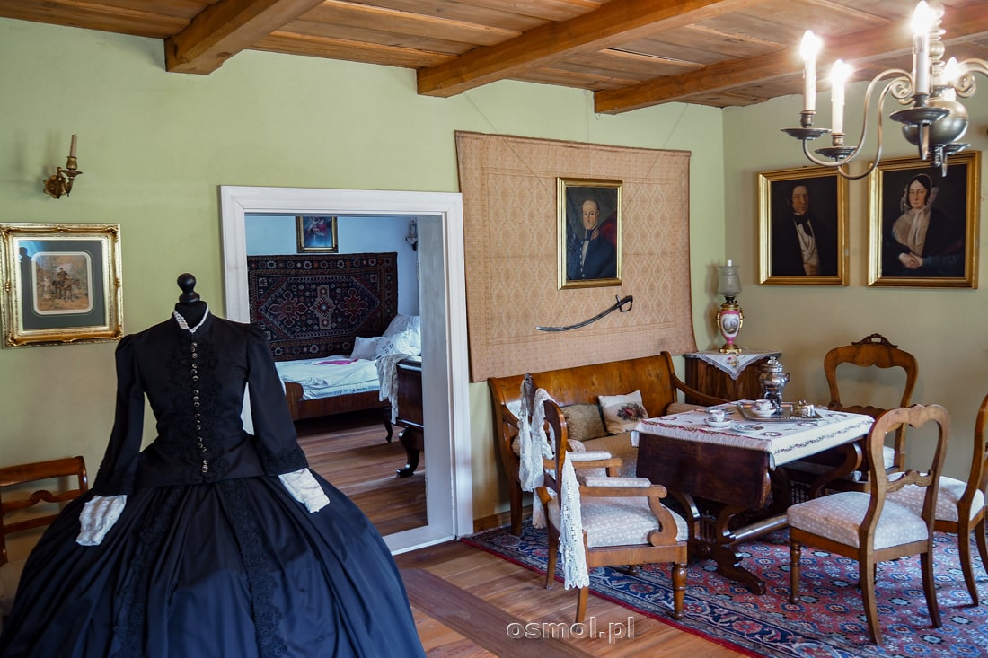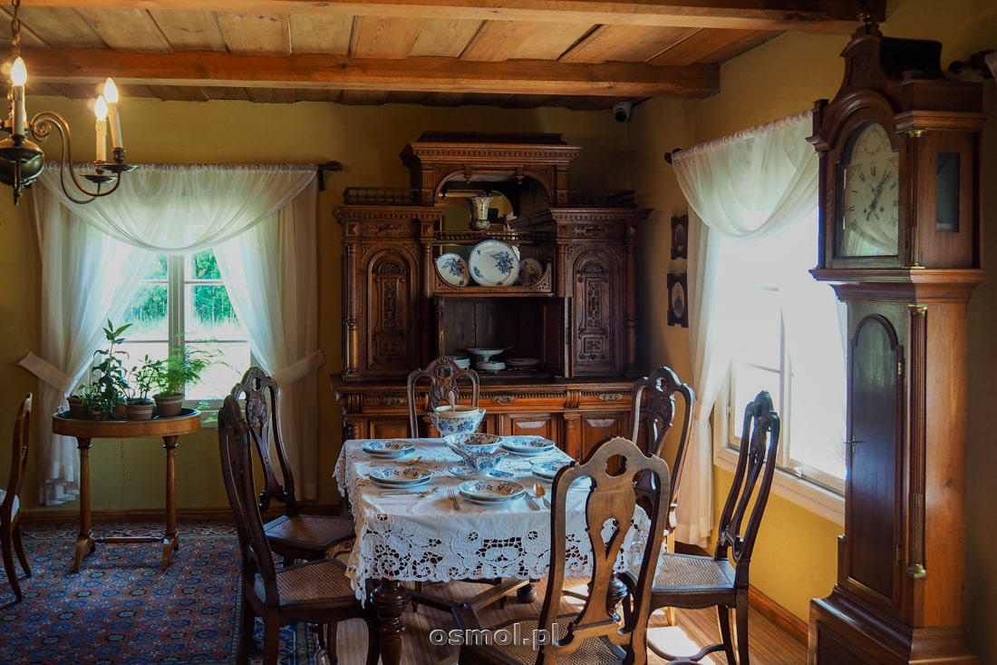 Jeśli coś mi się w skansenie w Sierpcu podobało mniej, to dwór z Uniszek Zawadzkich. W sumie może nawet nie sam dwór, co jego usytuowanie. Stoi on bowiem w szczerym polu i bardzo, ale to bardzo brakuje czegoś dookoła. Na przykład pięknie urządzonego ogrodu, jaki oglądałem w małym skansenie w Janowcu lub w dużym odpowiedniku – skansenie w Lublinie (Muzeum Wsi Lubelskiej). Jest droga dojazdowa, rondo przed dworem i łysa pustka. Bo jeśli chodzi o wyposażenie, narzekać nie można. Tu na szczęście nie ma szyby pleksi oddzielającej od wnętrza, zatem ze zdjęciem nie było problemu.