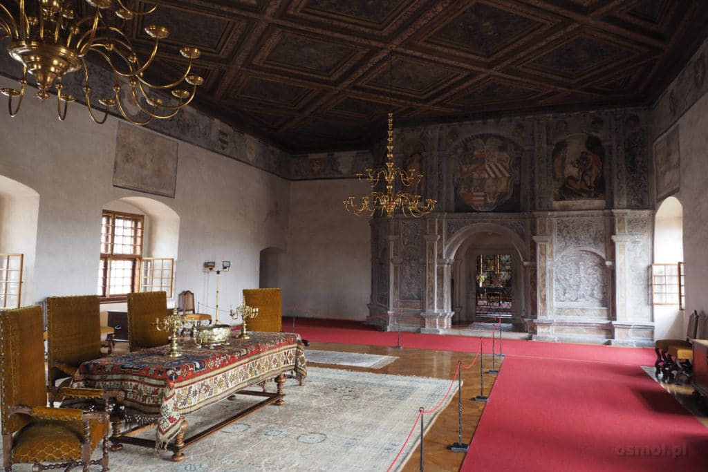 Zamku w Telczu niestety nie da się zwiedzić ot tak z marszu, na własną rękę. Tu niestety tak samo jak np. w Czeskim Krumlovie wejść można tylko z przewodnikiem, po wykupieniu biletu na określoną godzinę. Do wyboru są dwie trasy po komnatach oraz wejście do podziemi. Wybieram wizytę „na pokojach” i wraz ze sporą grupą zaczynam zwiedzanie. I przyznam, że ta prawie godzinna trasa nie pozwala się nudzić. Rzecz jasna przejdziemy tu przez prywatne sale, w których na co dzień żyli właściciele zamku, ale będziemy też mogli wstąpić do sal oficjalnych, jak np. sala balowa. Będzie okazja podziwiać mistrzów zduniarstwa i piękne piece, którymi ogrzewano pomieszczenia.