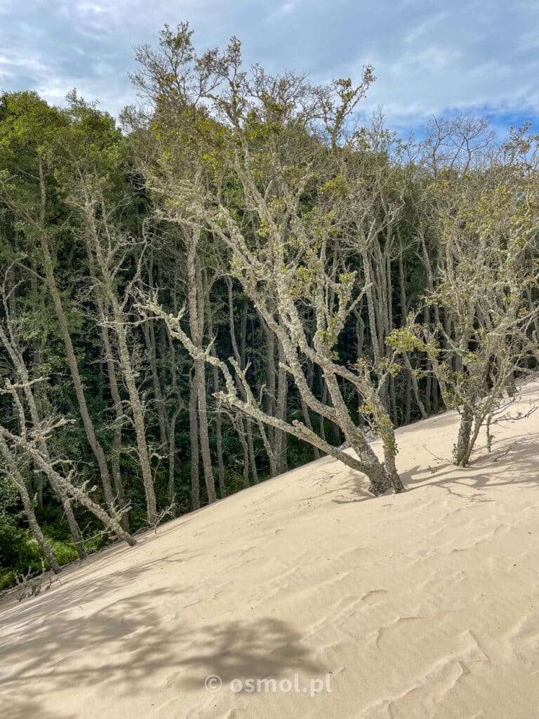 A potem wszedłem na ścieżkę wiodącą w kierunku głównej części wydmy. I tu totalne zaskoczenie, bo ten teren wygląda jak miejsce jakiejś katastrofy ekologicznej. Wszystko dlatego, że wydma przemieszczając się, pochłania to, co stanie na jej drodze. W tym przypadku jest to las. Dlatego nie zdziwcie się, kiedy wchodząc na wydmę od strony parkingu meleksów, zobaczycie kikuty wyschniętych drzew. To piasek zasypując drzewa, odcina je od wody, a tym samym powoduje, że usychają.